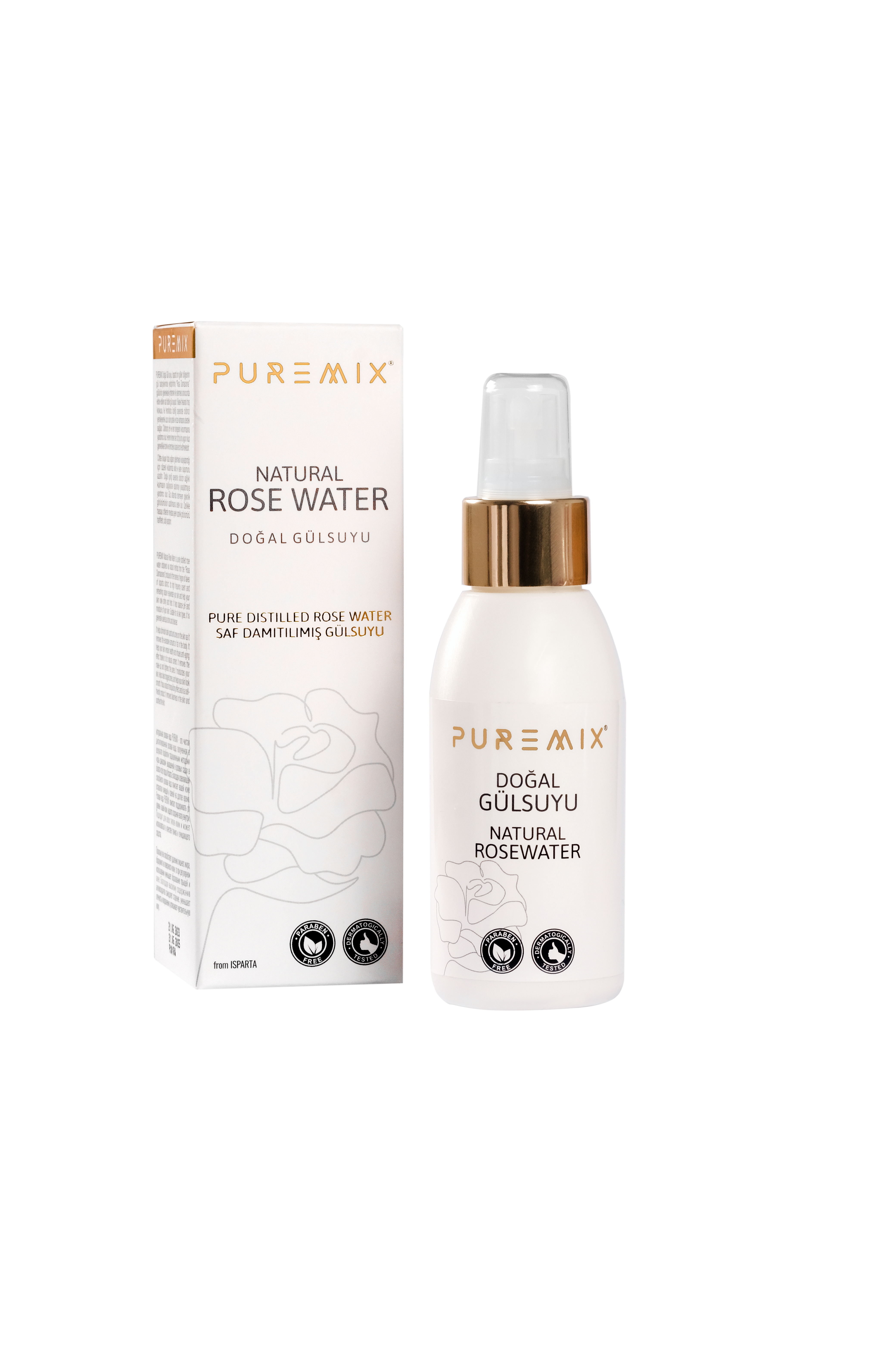 PUREMIX %100 Doğal Gül suyu, Isparta’nın göller bölgesinin gül bahçelerinde yetiştirilmiş “Rosa Damascena” gülünün geleneksel yöntemler ile işlenmesi sonucunda elde edilen saf distile gül suyudur. Yüksek frekanslı hoş kokusu ile ferahlatıcı özelliği sayesinde cildinizi yenileyerek uzun süre parlak ve taze kalmasına destek sağlar. Cildinizin pH ve nem dengesinin korunmasına yardımcı olur. Hemen hemen her cilt tipi için uygun olup genellikle tonik ve temizleyici olarak tercih edilmektedir.